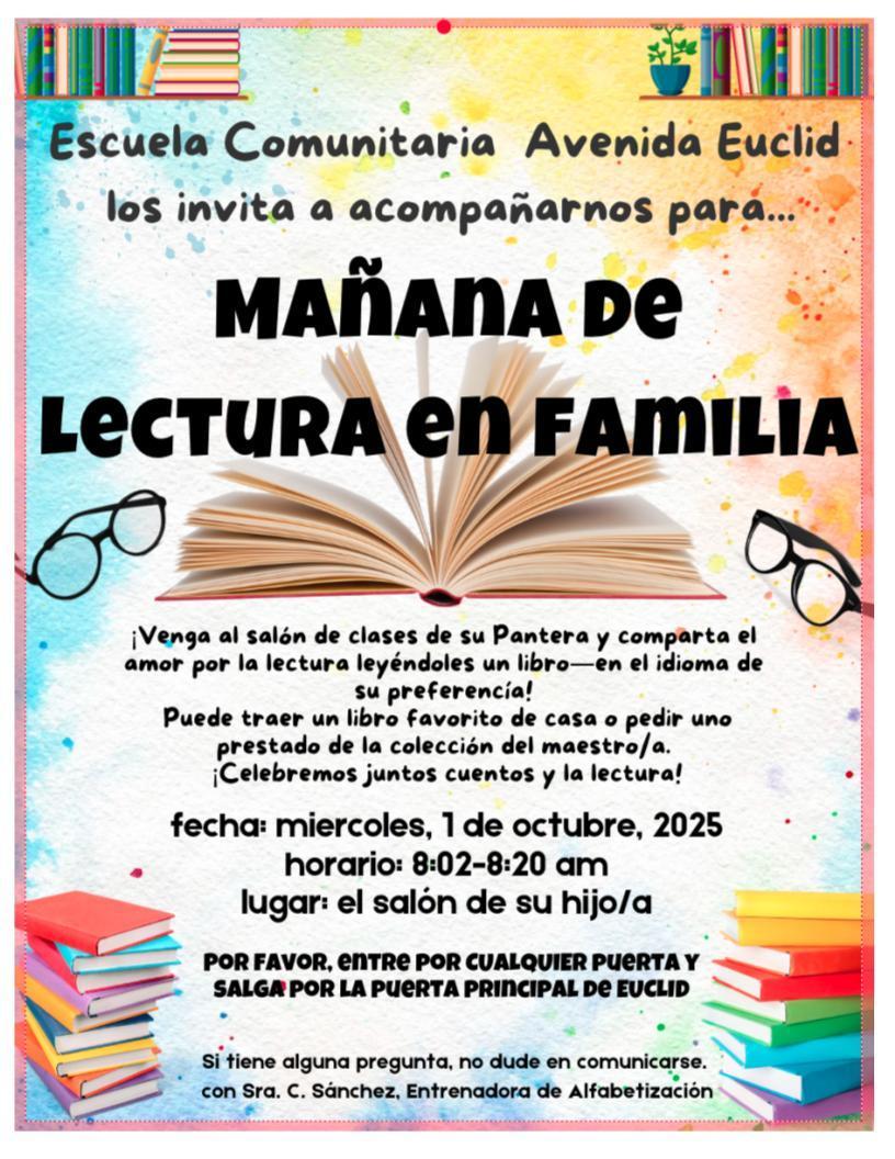 Entre al salón de su hijo(a) y comparta el amor por la lectura leyendo un libro a la clase en el idioma de su preferencia. Puede traer un libro de casa o elegir uno del salón.